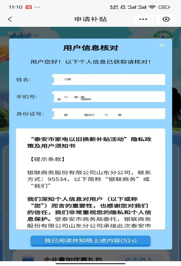 【申請補貼】用戶點擊進入“家電補貼券申請”界面,系統(tǒng)彈窗提示授權申請,用戶同意云閃付 APP 授權“魯換新”小程序獲取注冊手機號、姓名、證件號信息,進入“用戶信息核對”界面,信息核對無誤后,點擊“我已閱讀并知曉上述內容”。