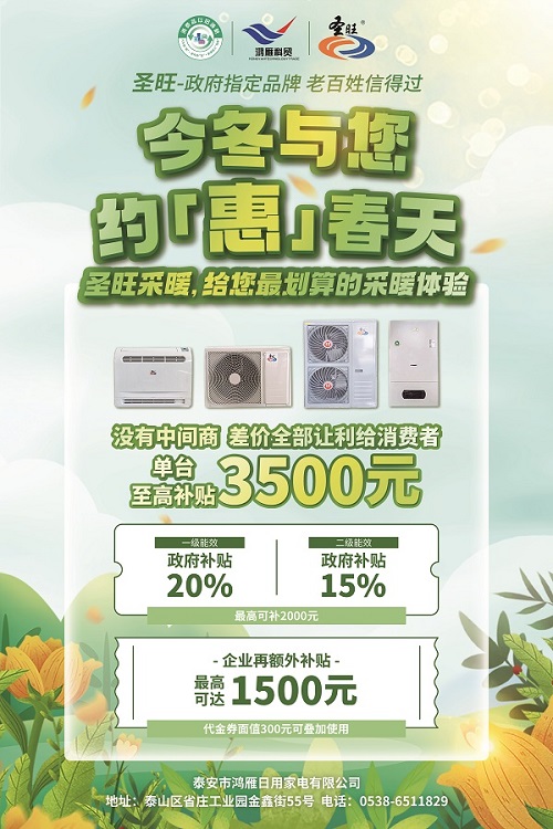 在這個寒冷的季節(jié),選擇圣旺品牌的空氣源熱泵熱風(fēng)機(jī)、燃?xì)獗趻鞝t及空氣能機(jī)組等采暖設(shè)備,不僅能享受優(yōu)惠補(bǔ)貼,更是為環(huán)保貢獻(xiàn)一份力量。歡迎廣大消費(fèi)者前來選購,讓我們一起溫暖過冬!