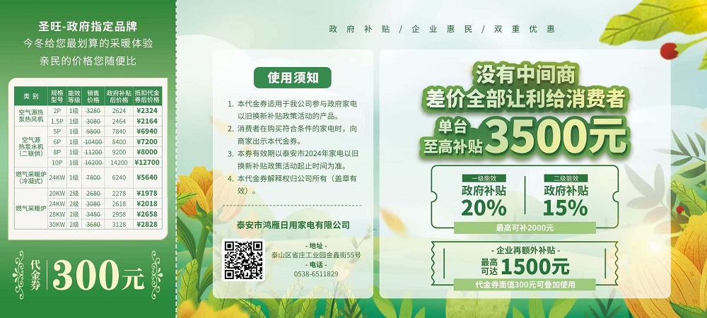 如今,泰安市舉行家電以舊換新補(bǔ)貼政策,我公司三類產(chǎn)品成功入圍,包括空氣源熱泵熱風(fēng)機(jī)、冷水機(jī)組和燃?xì)獗趻鞝t。消費(fèi)者購買我公司一級能耗產(chǎn)品可享受政府 20%的補(bǔ)貼,二級能耗產(chǎn)品可享受 15%的補(bǔ)貼。在此基礎(chǔ)上,我們面向全市消費(fèi)者再額外發(fā)放 300 萬的代金券,單張面值 300 元,共 1 萬張。這意味著在政府補(bǔ)貼的同時,消費(fèi)者還能享受我公司讓利 300 至最高 1500 元的優(yōu)惠,真正實現(xiàn)政企雙補(bǔ),福利翻倍。